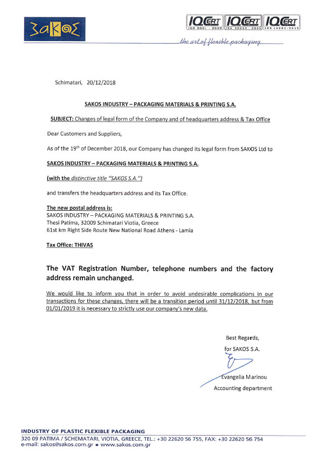 Sakos legal form and base address change